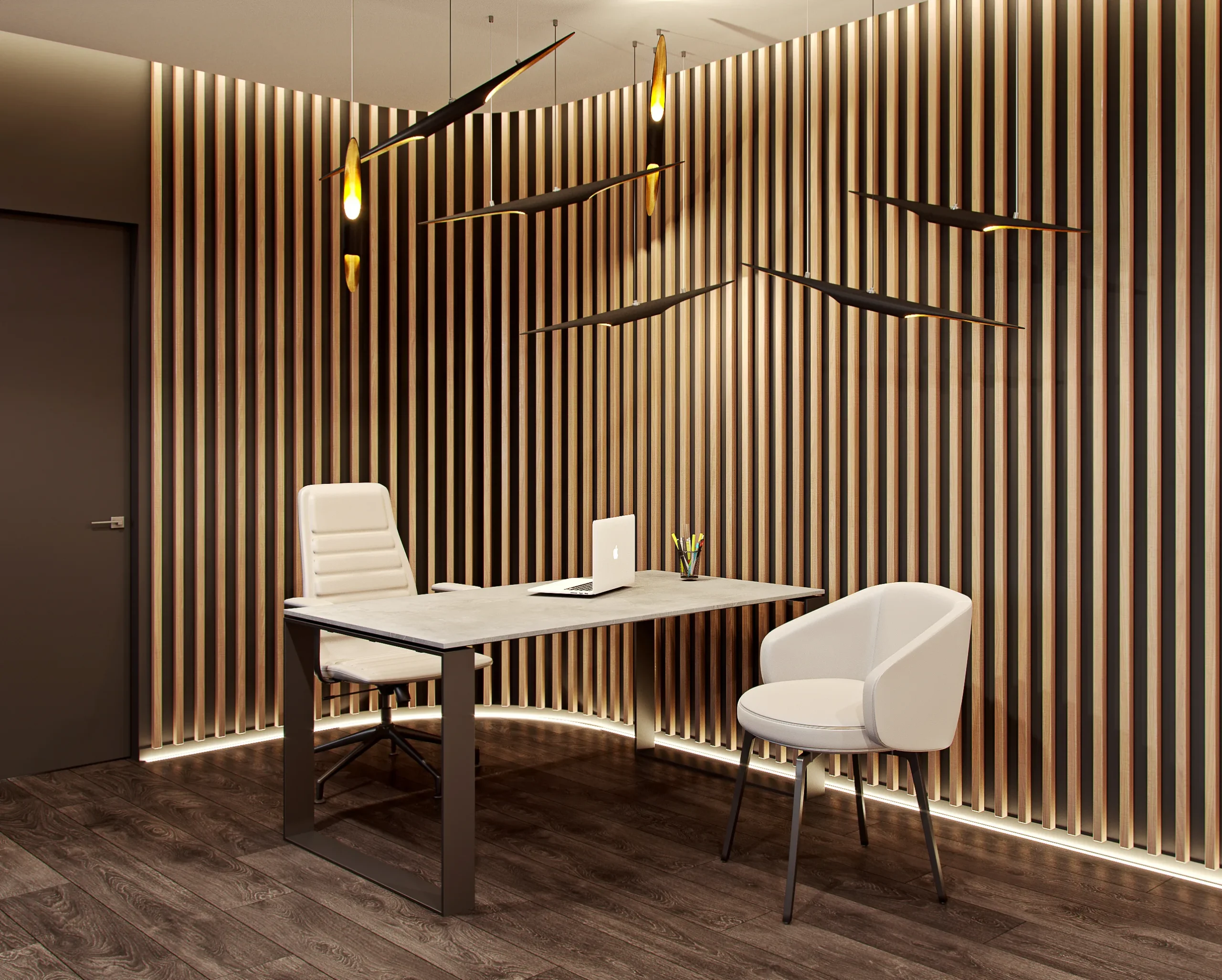 Деревянные панели — это классическое решение для создания теплой и уютной атмосферы. Они могут быть изготовлены из массива дерева, шпона или МДФ с отделкой под дерево. Деревянные панели отличаются экологичностью, долговечностью и отличными звукоизоляционными свойствами. Они идеально подходят для гостиных, спален и кабинетов, добавляя интерьеру элегантность и изысканность.