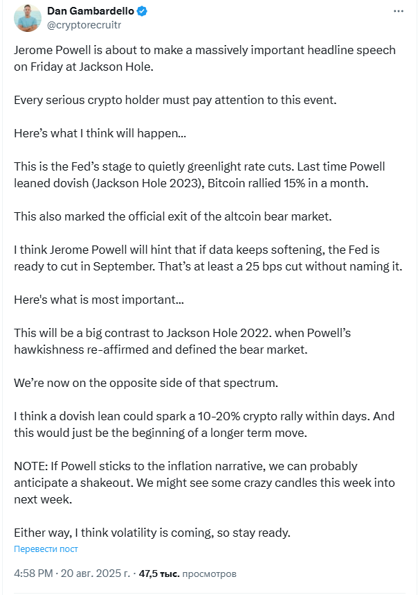 Итоги выступления Пауэлла окажут воздействие на рынок криптовалют. «Мягкий» сигнал о снижении стоимости заимствований смягчит финансовые условия, стимулируя приток средств в такие рисковые активы, как биткоин и эфир. Однако «ястребиный» акцент на инфляции может ограничить ликвидность и спровоцировать новую волну волатильности.